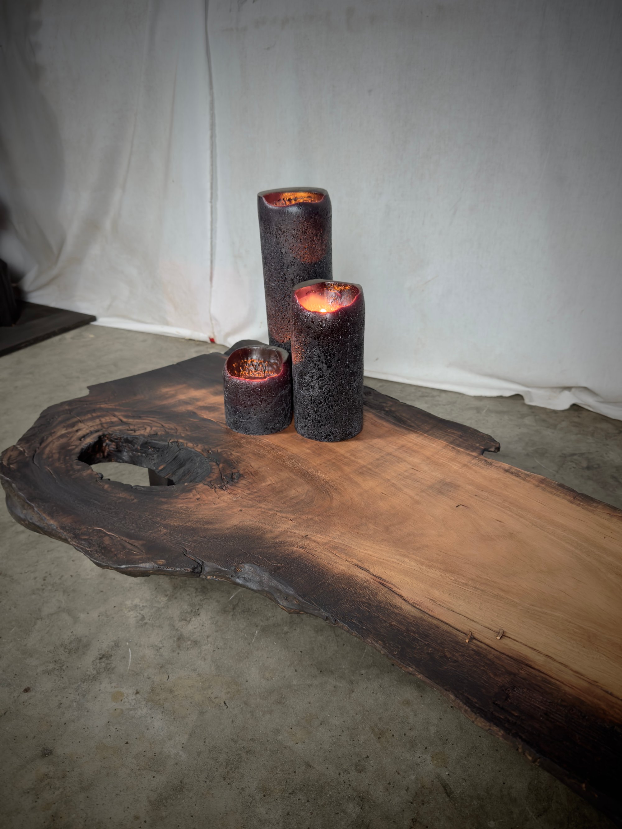 This piece was shaped slowly, with reverence. The twists were not corrected, only understood. Fire kissed the surface to draw out its story; char revealing, copper stitching. Oil and wax were worked deep into the fibres, sealing memory with warmth and touch.