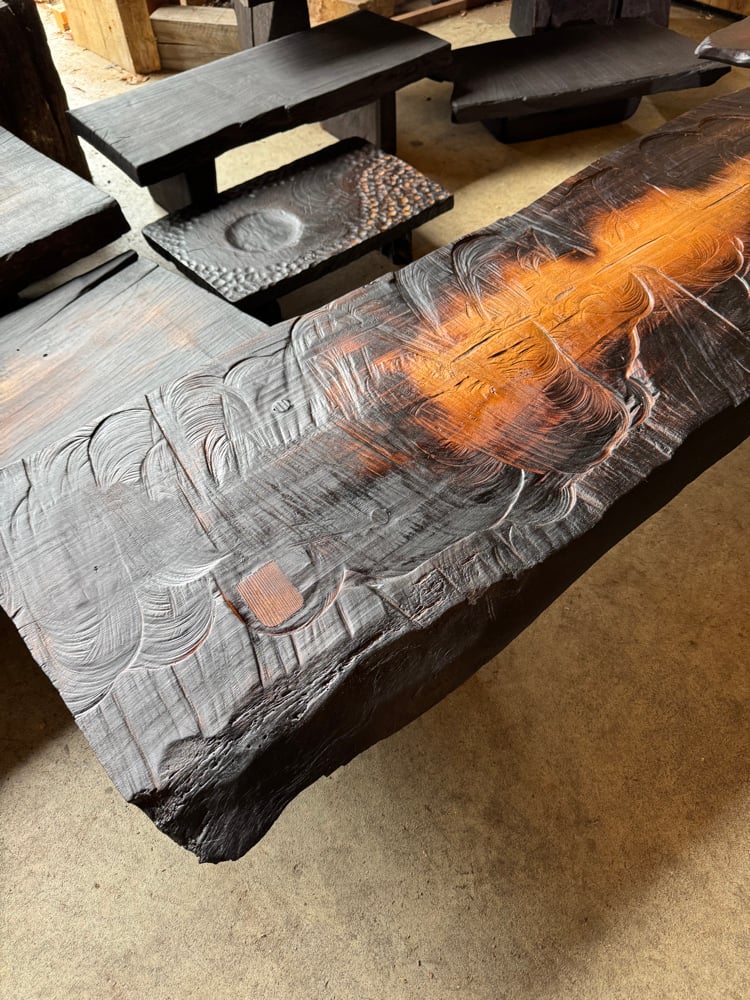 Hand-carved from reclaimed Australian Cedar, this tea table is shaped by fire and refined by hand—each curve and contour revealing the story within the grain. The Shou Sugi Ban finish enhances its raw beauty, while carved details echo the flow of water and smoke, grounding your space in both movement and stillness.